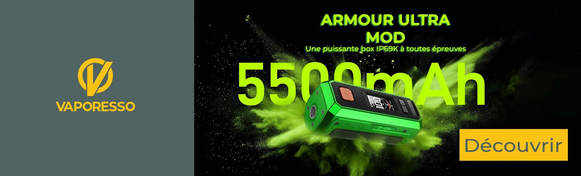 Découvrez la Box Armour Ultra Vaporesso, une box électronique 100W dotée d'une batterie intégrée de 5500 mAh pour une autonomie record. Certifiée IP68/IP69K et de grade militaire (MIL-STD-810H), elle est ultra-résistante à l'eau, aux chocs et à la poussière. Idéale pour les vapoteurs exigeants et nomades.